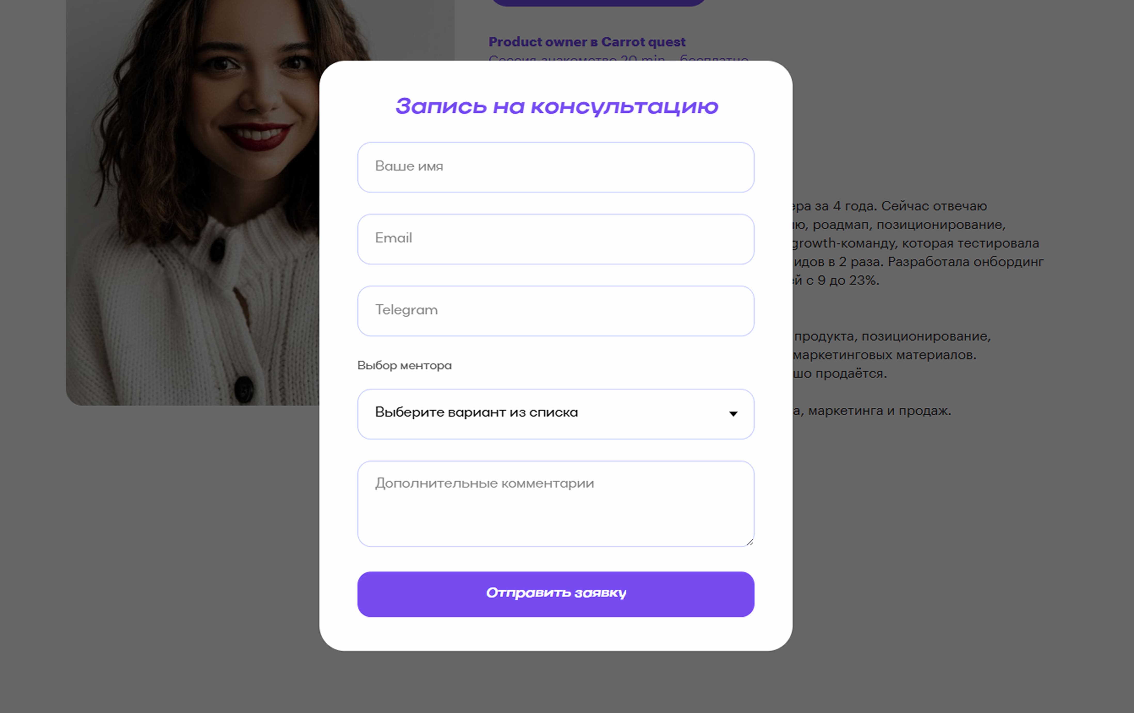 на консультацию, не проваливаясь внутрь карточки. По клику «Подробнее» открывается поп-ап с развернутой информацией об эксперте.