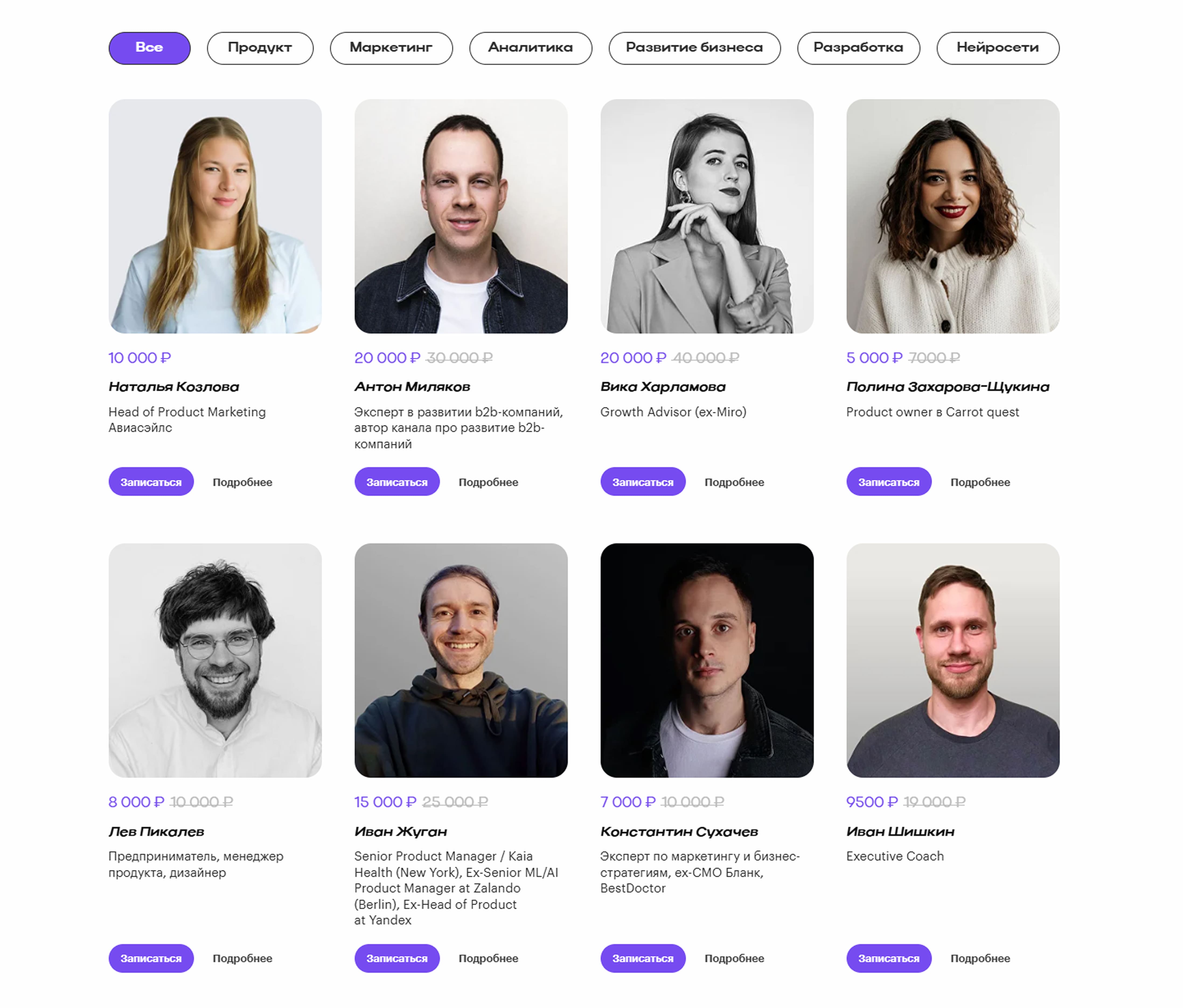 Пользователи, которые уже знакомы с экспертом, могут записаться на консультацию, не проваливаясь внутрь карточки. По клику «Подробнее» открывается поп-ап с развернутой информацией об эксперте.