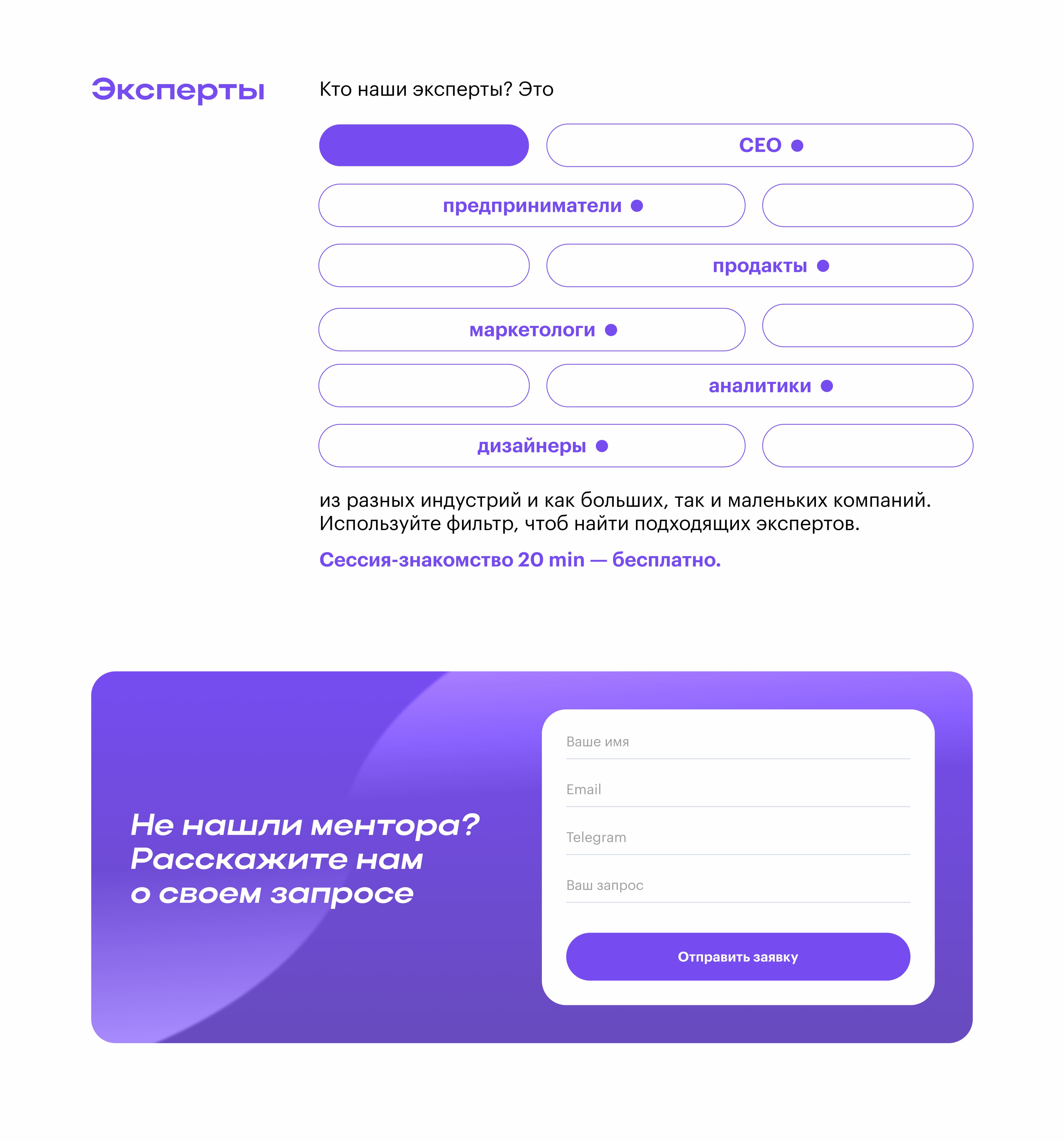 в работу одностраничник с карточками экспертов, фильтрацией и функцией записи к ментору. Дорабатывала отдельные фичи после запуска. Сайт принес 8 заявок в первый месяц.